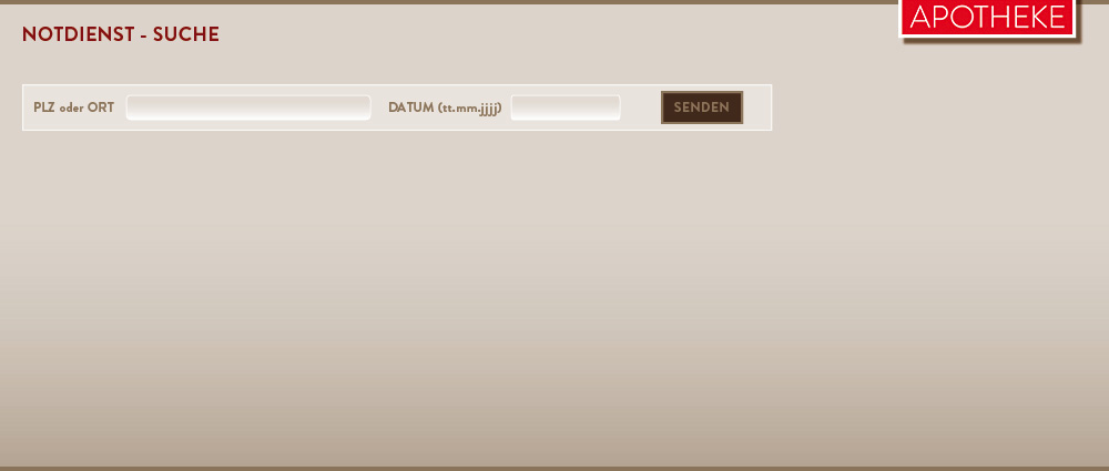 Die Notdienst-Suche zeigt Ihnen nach Eingabe eines Ortes oder einer Postleitzahl die nächstgelegenen Notdienst-Apotheken an.